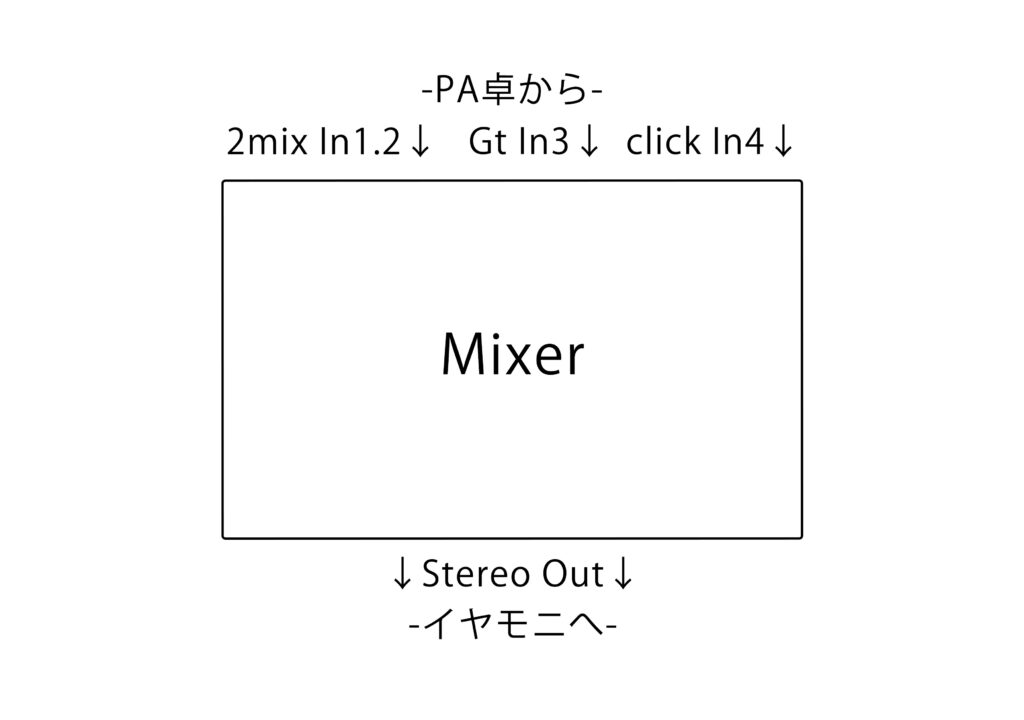 ミキサーを挟むことで手元でオケとクリックとギターのレベルを手元でそれぞれ弄れるので何かと便利です。